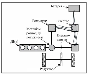 при пришвидшенні, коли необхідна додаткова потужність, використовується електродвигун, що живиться енергією від батареї і генератора;