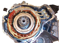 Синхронний восьмиполюсний електродвигун з постійними магнітами має високий крутний момент і вихідну потужність. Він розроблений високоефективним і має характеристики двигуна постійного струму. Ротор зроблений способом накладання шарів пластин, виготовлених із електромагнітної сталі. Пази ротора виконані V-подібної форми. Крім цього при високій напрузі 500 В електродвигун здатний розвивати потужність 50 кВт. На рисунку 2.8 показано фотографію електродвигуна.