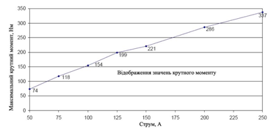 Керуючий механізм передачі використовувався, щоб захватити вал електродвигуна і обертати його з приростом в сегментах. Значення крутного моменту отримані при поставлянні синусоїдального струму в різні точки вала. Отримані дані використовувались для побудови графіка зображеного на рисунку 3.17. Струм і відповідні йому значення крутного моменту приведені в таблиці 3.2. Після випробування було підтверджено відсутність розмагнічування при нагріванні статора.