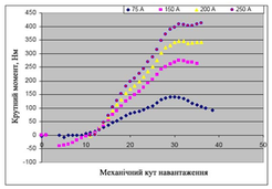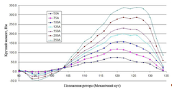 Рисунок 3.16 показує залежність крутного моменту електродвигуна від механічного кута повороту ротора при струмі 75, 150, 200 і 250 A, відповідно. При струмі 250 A крутний момент зростає до 400 Н∙м.