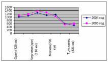 Как видно из гистограммы наиболее рентабельными являются международные автобусные перевозки в направлении Гомель – Чернигов, наименее рентабельными – в направлениях Гомель – Трускавец и Гомель – Феодосия. Кроме того, необходимо отметить что, уровни рентабельности в 2005 году снизились по сравнению с 2004 годом.