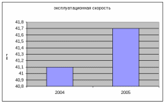 Гистограмма показывает, что эксплуатационная скорость международных автобусов за 2005 год возросла на 1,5% по сравнению с 2004 годом