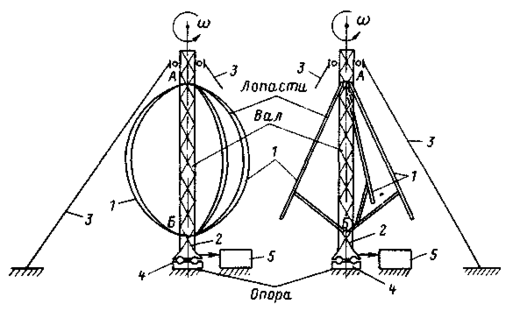 1 - лопасти; 2 - вал; 3 - растяжки; 4 - опора; 5 - привод
