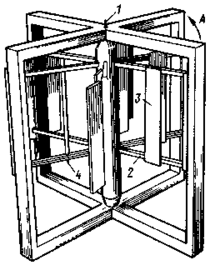 1 - вертикальная ось; 2 - горизонтальные планки; 3 - поворачивающиеся лопасти; 4 -ось лопасти