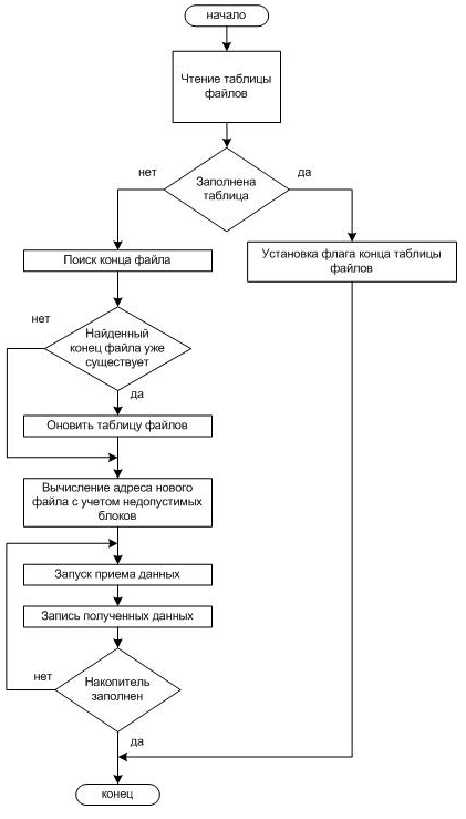 При включении питания контроллер считывает таблицу записей. Если она заполнена, то контроллер устанавливает соответствующий флаг и выходит из режима записи данных. Если таблица записей не заполнена, то контроллер начинает поиск конца записи испытания. Если найденный конец записи уже занесен в таблицу записей, то ее обновление не происходит, иначе в таблицу записей дописывается найденный конец записи. После чего вычисляется адрес начала новой записи с учетом недопустимых блоков, запускается прием данных через Link и начинается запись принимаемых данных в основной накопитель.