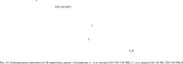 На рис.11 приведена температурная зависимость I/I0 (nT/n0T) аценафтена в н.-октане (кривая 2) и в н.-гексане (кривая 1) с целью их сравнения, когда донором являлся бензофенон. Концентрация примесей в н.-октане для данного опыта была выбрана меньшей (СБ=СА= 2.510-3 М), где СБ и СА – концентрации донора и акцептора соответственно), чем в н.-гексане (СБ=СА=10-2 М).