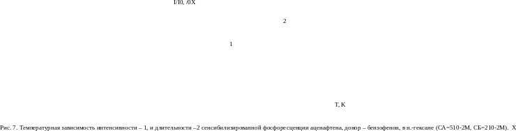 В области от 77 до 155 К (область 1) сенсибилизированная фосфоресценция испытывает температурное тушение. Уменьшение интенсивности I сопровождается незначительным падением . Более медленное изменение в сравнении с I , по-видимому, обусловлено тем, что величина I уменьшается за счёт тушения триплетных молекул как акцептора, так и донора энергии. Измен
