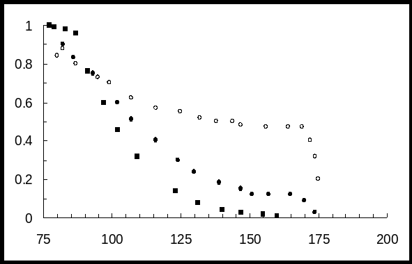 На рис.10 (кривая 2) изображена температурная зависимость I/I0 сенсибилизированной фосфоресценции нафталина в н.-декане, донор – бензофенон. Температурная область 1, где наблюдается тушение I/I0, в данном опыте лежит в более широком диапазоне – 77- 165 К. При достижении конечной температуры из этой области наблюдается почти полное тушение сенсибилизированной фосфоресценции, I/I0 падает до значения 0.05. Такое сильное тушение не было обнаружено ни для одной донорно-акцепторной пары в н.-гексане (рис. 7, 9, 10 (кривая 1)), где величина I/I0 в конце температурной области 1 достигала значений от 0.35 до 0.45. При этом в н.-гексане использовались более высокие концентрации примесей, чем в н.-декане. Температурная область 2, в которой происходит рост интенсивности, 165 –175 К, в н.-декане лежит намного ниже точки плавления растворителя –243 К. От 175 К происходит дальнейшее уменьшение I/I0, уже при 188 К достигающее значение 0.05.