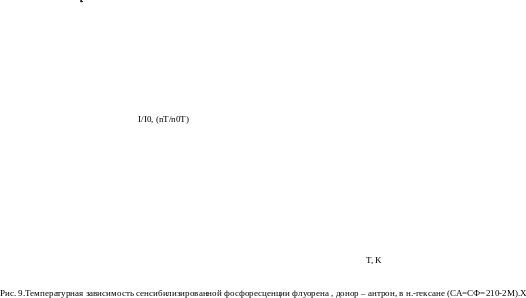 а рис.9 представлена температурная зависимость относительной интенсивности сенсибилизированной фосфоресценции I/I0 (что совпадает с изменением относительной концентрации триплетных молекул nT/n0T, где n0Т – концентрация триплетных молекул акцептора при 77 К) флуорена в н.-гексане, когда донором являлся антрон. Качественно характер кривой совпадает с таковым для донорно-акцепторной пары аценафтен-бензофенон (рис.7).