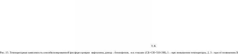 С этой целью был исследован характер изменения интенсивности сенсибилизированной фосфоресценции для донорно-акцепторных пар бензофенон-нафталин в н.-гексане (рис. 15) при повышении его температуры от 77 К до 175 К (кривая 1) и последующем охлаждении от 175 К до 77 К (кривая 2). Также было исследовано изменение интенсивности сенсибилизированной фосфоресценции в температурной области 1 для данной пары при изменении температуры раствора от 77 до 140 К и последующем его охлаждении до 77 К (кривая 3).