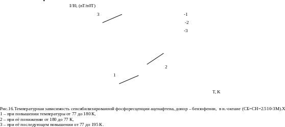 Для окончательного решения вопроса о необратимом характере процесса снятия концентрационного тушения в температурной области 2 был проведён следующий эксперимент. Исследовалась температурная зависимость интенсивности сенсибилизированной фосфоресценции аценафтена в н.-октане при нагревании раствора от 77 К до 185 К (рис.16, кривая 1), последующем его охлаждении от 185 К до 77 К (рис. 16, кривая 2) и повторном нагревании от 77 К до 180 К (рис. 16, кривая 3). Как и в случае нафталина в н.-гексане (рис. 15) изменение интенсивности сенсибилизированной фосфоресценции аценафтена при его нагревании от 77 К до 185 К имеет необратимый характер. Т.е. при последующем охлаждении зависимость имеет монотонный характер. Для одних и тех же температур интенсивность фосфоресценции при охлаждении раствора в несколько раз больше, чем при его нагревании. При последующем увеличении температуры от 77 К до 185 К процесс становится обратимым, на что указывает совпадение кривых 2 и 3. Последний результат говорит о полном снятии концентрационного тушения в температурной области 2, чем также подтверждает данную гипотезу.