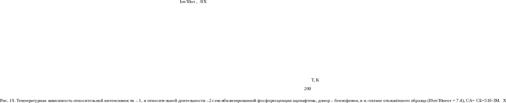 меньшение интенсивности сенсибилизированной фосфоресценции отожжённого образца при повышении температуры сопровождается падением времени затухания Т (кривая 2, рис. 19). Это и монотонный характер температурной зависимости интенсивности сенсибилизированной фосфоресценции отожжённого образца указывают на то, что в системе остаётся только один процесс, влияющий на концентрацию триплетных молекул акцептора энергии – динамическое тушение.