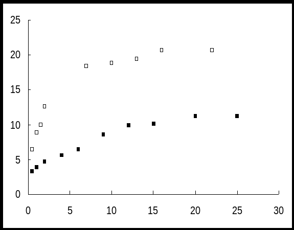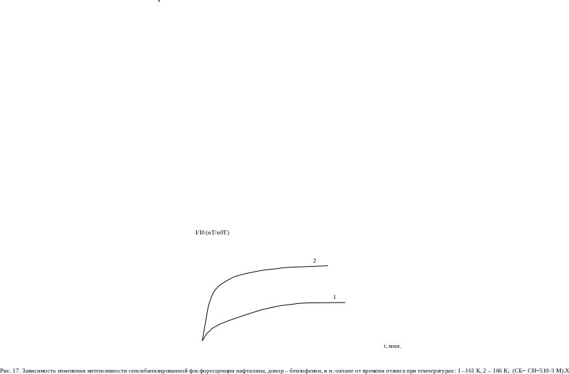 а рис. 17 приведена зависимость относительной интенсивности сенсибилизированной фосфоресценции I/I0 (nT/n0T) нафталина в н.-октане от времени отжига образца при двух фиксированных температурах: Т1 = 161 К (кривая 1) и Т2 = 166 К (кривая 2). Здесь I – интенсивность сенсибилизированной фосфоресценции охлажденного до 77 К после отжига в течение времени t образца, а I0 – интенсивность фосфоресценции неотожжённого образца при 77 К. Как видно из рисунка, интенсивность сенсибилизированной фосфоресценции, а следовательно и концентрация триплетных молекул нафталина растут с увеличением времени выдерживания образца при фиксированной температуре из области 2. Значение I/I0 (nT/n0T) с увеличением времени отжига монотонно стремится к предельному значению. Это указывает на то, что процесс, приводящий к увеличению числа триплетных молекул акцептора, участвующих в излучении сенсибилизированной фосфоресценции, характеризуется насыщением.