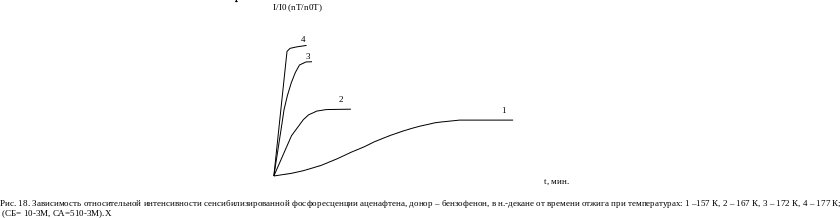 На основании вышеизложенного и (40) можно предположить о наличии процессов в температурной области 2, приводящих к увеличению числа триплетных молекул акцептора, участвующих в излучении сенсибилизированной фосфоресценции с определённой энергией активации Еак. Тогда выдерживание образца при фиксированной температуре из аномальной области так же должно приводить к увеличению интенсивности сенсибилизированной фосфоресценции. Результаты таких исследований кинетики процесса при различных температурах приведены в следующей главе.
