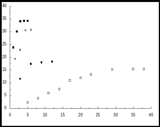 Такие же исследования были проведены для пары бензофенон-аценафтен в н.-декане (рис. 18) при четырёх фиксированных температурах отжига: Т1 = 157 К (кривая 1), Т2 = 167 К (кривая 2), Т3 = 172 К (кривая 3) и Т4 = 177 К (кривая 4). Для данной пары, как и для предыдущей, интенсивность сенсибилизированной фосфоресценции, а следовательно и число триплетных молекул акцептора энергии I/I0 (nT/n0T) растет с увеличением времени отжига. Предельные значения, к которым стремится I/I0 (nT/n0T), и для данной пары зависят от температуры отжига. С повышением температуры отжига предельные значения I/I0 (nT/n0T) увеличиваются. Так, при температуре Т1 = 157 К отжиг приводит к максимальному значению I/I0 (nT/n0T) 15, при Т2 = 167 К - I/I0 (nT/n0T) 18, при Т3 = 172 К – I/I0 (nT/n0T) 30 и при Т4 = 177 К – I/I0 (nT/n0T) 35. Скорость процесса, приводящего к увеличению интенсивности сенсибилизированной фосфоресценции аценафтена так же возрастает с увеличением температуры отжига.