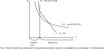Экспоненциальная зависимость от 1/T предполагает резкое падение в начальной области и стремление к постоянному минимальному значению ∞ при высоких температурах как в случае диффузии, так и в процессе ассоциации. Знание коэффициентов ЕAS, ED и АS∞ и D∞ могут позволить качественно оценить режим процесса ассоциации в твёрдом теле.