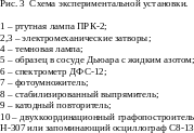 Регистрирующая часть установки включала в себя двухкоординатный графопостроитель Н-307 при записи спектров излучения и кинетики фосфоресценции молекул акцептора. При исследовании кинетики фосфоресценции молекул донора двухкоординатный графопостроитель заменялся на универсальный запоминающий осциллограф С8-13. Для согласования входного сопротивления самописца и выходного сопротивления фотоэлектронного умножителя использовался катодный повторитель, постоянную времени которого можно было изменять от 0,01 до 1,0 с. Линейность работы усилителя постоянного тока проверялась при подаче на ФЭУ светового потока регулируемого изменением входной щели монохроматора. Механическая постоянная времени графопостроителя не превышала 0,03 с.