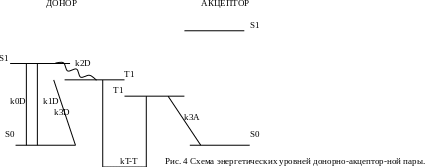 Рассмотрим кинетику накопления триплетных молекул акцептора. Для этого используем трехуровневую схему для молекул донора и двухуровневую для молекул акцептора (рис.4), поскольку другие энергетические уровни не играют значительной роли в заселении триплетного уровня молекул акцептора.