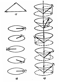 Рисунок 6 - Типичные примеры не коллинеарных атомных магнитных структур: а) антиферромагнитная треугольная; б) антиферромагнитная винтовая плоская; в) ферромагнитная винтовая по конической поверхности.