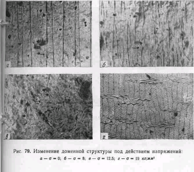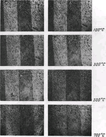 В отсутствие поля доменная структура тонких ферромагнитных пленок обладает высокой температурной стабильностью. На рисунке 57 показана доменная структура железной пленки толщиной 1600Ǻ при различных температурах (от –100 до +6500 С). Как видно из рисунка, и исследованном интервале температур доменная структура не изменяется, что весьма важно при использовании тонких ферромагнитных пленок в счетно-решающих системах.