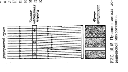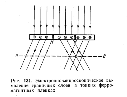 Изучение структуры ферромагнитных пленок при помощи электронного микроскопа основано на взаимодействии электронов с магнитным полем намагниченных пленок. Поэтому этот метод позволяет более детально изучить структуру ферромагнитных пленок, чем метод порошковых фигур или магнитооптический метод, так как применяемые в них оптические микроскопы имеют на много меньшую разрешающую способность, чем электронный микроскоп.
