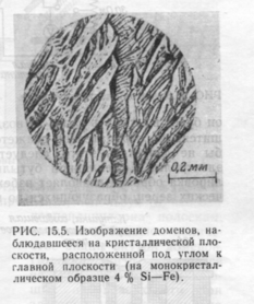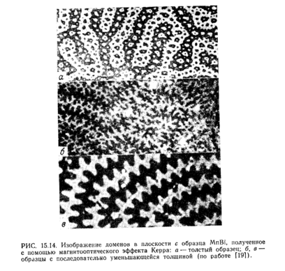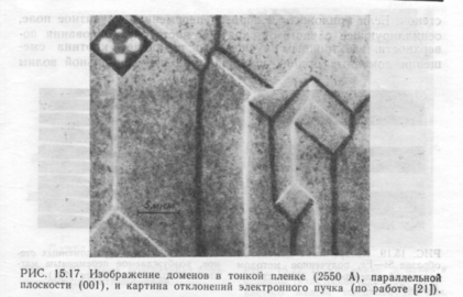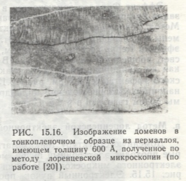 Для достаточно тонких пленок (толщенной менее 1000 А) можно использовать магнитооптический эффект Фарадея и методы электронной микроскопии. В настоящее время методы электронной микроскопии исследования доменной структуры тонких ферромагнитных пленок получили широкое распространение. С помощью электронного микроскопа могут быть выявлены как сами домены, так и их границы, причем независимо от направления поворота вектора намагниченности в граничном слое соседние граничные слои оказываются попеременно темными и светлыми. Электронно-микроскопический метод изучения доменной структуры позволяет определить даже небольшие нарушения однородности намагниченности внутри самих доменов в ферромагнитной пленке .