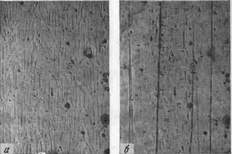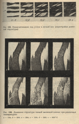 Из сказанного вытекает, что доменная структура тонких ферромагнитных пленок существенно зависит от способа изменения поля. На рисунке 54 показана доменная структура железной пленки при размагничивании ее под различными углами к оси легкого намагничивания. Как видно из этого рисунка, доменная структура при размагничивании под разными углами оказывается совершенно различной.