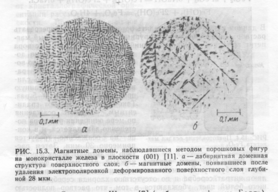 При исследовании доменной структуры тонких ферромагнитных пленок, как и в случае массивных ферромагнетиков, могут быть использованы методы порошковых фигур и магнитооптический эффект Керра. Для достаточно тонких пленок (толщиной менее 1000Ǻ) можно использовать, как указывалось выше, магнитооптический эффект Фарадея и методы электронной микроскопии.