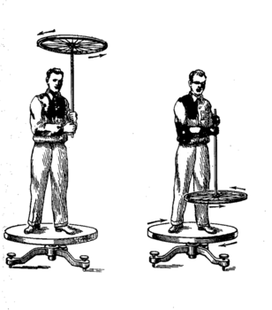 Интересный и очень поучительный опыт можно провести на так называемой скамье Жуковского с велосипедным колесом. Скамья Жуковского представляет собой небольшую площадку, которая легко вращается около вертикальной оси. Если на такую площадку поставить человека, дав ему в руки быстро вращающееся на вертикальной оси велосипедное колесо, то такая система будет обладать некоторым механическим моментом.