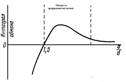 Обменное воздействие характеризуется так называемым интегралом обмена, который очень сильно зависит от расстояния между атомами в кристаллической решетке. При значительных расстояниях между атомами это взаимодействие равно нулю. С уменьшением расстояния взаимодействие растет, интеграл обмена положителен. При положительном значении интеграла обмена взаимодействие приводит к параллельной ориентации спинов, что в свою очередь ведет к самопроизвольной или спонтанной намагниченности вещества – основного свойства ферромагнетизма. При дальнейшем уменьшении расстояния интеграл обмена, пройдя максимальное значение, начинает убывать и становиться отрицательным. При отрицательном значении интеграла обмена спины электронов самопроизвольно устанавливаются антипараллельно друг другу, что приводит к особому явлению, называемому антиферромагнетизмом. Как показали исследования, интеграл обмена положителен, т.е. вещество обладает ферромагнитными свойствами, если отношение диаметра атома к диаметру незаполненной оболочки больше 1,5.