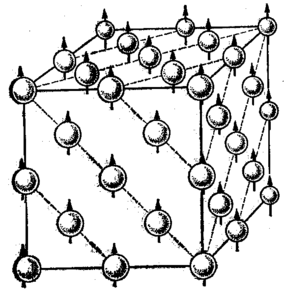 Ферромагнитные свойства проявляются только ниже некоторой определенной температуры, в кристаллическом состоянии. Как было показано советским физиком Я.И. Френкелем, ферромагнетизм возникает благодаря особому взаимодействию электронов незаполненных слоев между соседними атомами. Такое взаимодействие называется «обменным», ибо взаимодействующие электроны перестают быть связанными с определенными атомами, «коллективизируются». Электрон, принадлежащий первому атому, оказывается принадлежащим также и второму атому, и наоборот. Атомы как бы обмениваются электронами. Поэтому такое взаимодействие называется обменным.