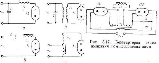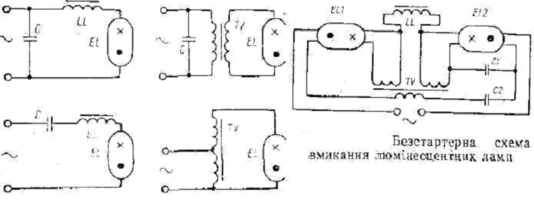 Люмінесцентні лампи можуть вмикатися також за допомогою безстартерного ПРА (рис. 8). Тут ПРА живиться від трансформатора ТУ, який попередньо нагріває електроди лампи. Такі схеми застосовуються в металевих заземлених світильниках, які живляться від електричної мережі напругою 380/220 В.