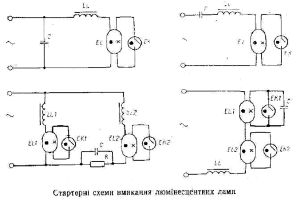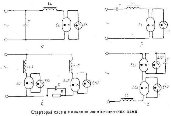 Для підвищення коефіцієнта потужності мережі та блокування радіозавад, які створюються розрядами в лампах й іскрами в стартерах, в схеми вводять компенсуючі конденсатори.