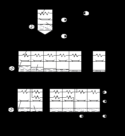 В адиабатных выпарных установках реализуются различные способы оттяжки парогазовой смеси: с параллельным, последовательным и параллельно-последовательным отводом. На рисунке 9 представлены различные варианты схем оттяжек: на конденсатор (или эжектор) с перепуском парогазовой смеси во всех ступенях испарения установки; с оттяжками из всех ступеней без перепусков; с перепусками газов между всеми ступенями и оттяжкой из последней; с перепусками газов между всеми ступенями и их оттяжкой из последней и первой (где велика деаэрация жидкости); с перепусками между ступенями и оттяжками из последней и одной или нескольких промежуточных и т. д.