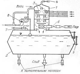 1- цилиндрическая колонка; 2- резервуар; 3- тарелки; 4- штуцер; 5- водоуказательное стекло; 6- устройство автоматического регулирования подачи пара; 7- предохранительный клапан; 8- устройство автоматического регулирования подачи воды.