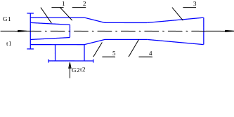 Водоструйный эжектор на рисунке 5 состоит из камеры смешения 2, имеющей форму цилиндра (или конфузора), диффузора 3, сопла 1 и предкамеры 5, соединяющей камеру смешения с входными патрубками и соплом.