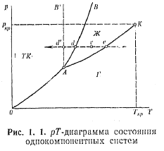 Рідкий стан речовини є проміжним між твердим і газоподібним (мал. 1.1). Область існування рідини обмежена з боку низьких температур переходом в твердий стан (точки cdd') а з боку високих — переходом в газоподібний стан (точки с, е). Лінія АК, що розділяє рідку і газоподібну фази, закінчується критичною точкою, відповідній температурі Ткр і тиску Pкр, вище за яких неможливе існування рідини в рівновазі з парою. Лінія рівноваги рідина — тверда фаза критичної точки не має. У металів температура плавлення підвищується із збільшенням тиску (крива АВ); у льоду, кремнію, германію — знижується (крива АВ'). Точка А на діаграмі стану відповідає температурі і тиску, при яких в закритій посудині знаходяться в рівновазі тверда, рідка і газоподібна фази. Рідині поєднують деякі властивості як твердих тіл, так і газів. Тверді тіла бувають кристалічні і аморфні. По типах зв'язку кристали діляться на атомні, іонні, металеві і молекулярні. Вони мають ближній і дальній порядок. Ближній порядок означає правильне розташування біля фіксованого атома, іона або молекули певного числа найближчих сусідів. Дальнім порядком називається розташування частинок в певній послідовності з утворенням єдиної тривимірної гратки. За наявності дальнього порядку відстань до будь-якого атома кристала обчислюється через параметри елементарної комірки по формулі