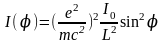 де m — маса електрона; e — його заряд; c — швидкість світла; φ — кут між напрямами коливання електрона і розсіюванням; e2/(mc2)— класичний радіус електрона, рівний 2,8•10-15м; [e2/(mc2)]2— його поперечник розсіювання. З (20) видно, що із збільшенням кута φ інтенсивність розсіювання збільшується, досягаючи найбільшого значення при φ = 90° (мал. 2.1).