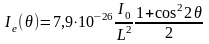 де (1+cos22θ)/2 = ρ(θ) — кутова залежність інтенсивності розсіяного рентгенівського випромінювання одним електроном названа поляризаційним чинником. Наявність цього множника у формулі (21) указує на те, що рентгенівське випромінювання при розсіянні частково поляризується. При гранично малих кутах розсіювання поляризаційний чинник рівний одиниці. Із збільшенням кута розсіювання цей чинник зменшується і при 2θ = 90° досягає значення, рівного 1/2. Таким чином, в різних напрямах інтенсивність розсіювання рентгенівського випромінювання одним електроном неоднакова. У напрямі первинного пучка і у зворотному напрямі інтенсивність розсіювання максимальна, а в перпендикулярному напрямі — мінімальна. Якщо у формулу (21) підставити значення постійних m, e і c то одержимо