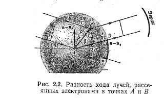 Розглянемо спочатку два електрони, що знаходяться в атомі в точках А і B на відстані r один від одного. Позначимо n і n0 — одиничні вектори у напрямі нормалі до фронту падаючої і розсіяної хвилі (мал. 2.2). Різниця ходу проміння, розсіяного електронами,
