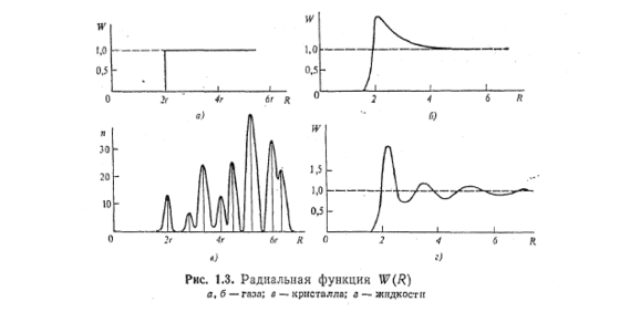 показуючому, що сума вірогідності знаходження даного атома на всіх можливих відстанях від фіксованого рівна одиниці. Функція W(R) називається радіальною функцією розподілу атомів або молекул. Її значення визначають вірогідність виявлення якого-небудь атома на відстані R від фіксованого атома. Оскільки сили відштовхування перешкоджають взаємному проникненню атомів, то в інтервалі 0 ≤ R < 2r ( r — радіус атома) функція W(R)= 0. При R→ ∞ вона прагне до одиниці.