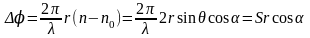 Якщо кут між напрямами первинного пучка і уявною площиною, що відображає, позначити θ, то кут розсіювання 2θ. Очевидно, що | n—n0 | = 2sinθ (мал.2.2) Позначаючи α — кут між векторами r і n—n0, одержимо для різниці фаз розсіяних хвиль вираз