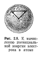 Електростатичний потенціал в будь-якій точці атома складається з потенціалу позитивно зарядженого ядра і потенціалу електронної оболонки. Потенціал в точці r, створюваний зарядом ядра, рівний —Ze/r. Щоб визначити потенціал, створюваний в тій же точці зарядом електронної оболонки атома, розглянемо елемент об'єму dV1 на відстані r1 від центру О атома (мал. 2.8). Заряд, зосереджений в цьому об'ємі, рівний eρe(r1)dV1. Потенціал в точці r, створюваний цим зарядом, eρe(r1)dV1/|r—r1|. Потенціал в тій же точці, створюваний всією електронною оболонкою атома, представиться як