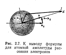 де r — відстань від центру атома до електрона; L — відстань від центру O атома до точки спостереження A; l = L—rn; (r n) — проекція вектора r на напрям розсіювання n (мал. 2.7). Якщо точка спостереження знаходиться на великій відстані від центру атома, то в знаменнику (49) можна замінити l на L. Тоді