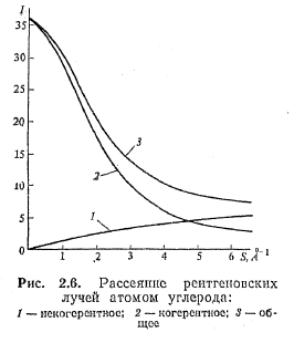 Некогерентне розсіювання дає безперервний фон, інтенсивність якого зростає з кутом розсіювання. При великих значеннях S некогерентне розсіювання від елементів з малим атомним номером може перевершувати когерентне у декілька разів (мал. 2.6). Тому воно завжди віднімається із загального розсіювання. Звичний спосіб обліку поправки на некогерентне розсіювання полягає в обчисленні його величин теоретично по одній з формул, виведених для цієї мети. Одна з них має вигляд