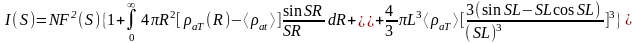 Перший доданок визначає інтенсивність розсіювання окремими атомами за відсутності інтерференції між ними; друге — розподіл інтенсивності розсіювання за наявності інтерференції, обумовленої ближнім порядком в розташуванні атомів. Третій доданок визначає інтенсивність розсіювання у області дуже малих кутів. Числове значення цього доданку залежить від розміру і форми зразка і не залежить від його внутрішньої структури. Дійсно, максимальне значення функції φ(SL)= 3(sinSL—SLcosSL)/(SL)3 дорівнює одиниці при SL = 0. Із зростанням SL функція φ(SL) здійснює сильно затухаючі осциляції щодо нульових значень, визначуваних рівнянням SL = tgSL, тобто при SL рівних 4,49; 7,74. При SL> 4,49 значення φ(SL) малі в порівнянні з одиницею. З рівності S = 4,49/L витікає, що для зразків порядка 0,1—0,2 см значення S = 4,5•10-7 Å -1. Малокутове розсіювання на зразках таких розмірів співпадає з первинним пучком. Його інтенсивність не може бути заміряна за допомогою звичних засобів. Це розсіювання експериментально виявляється в тих випадках, коли в досліджуваній речовині є флуктуації, колоїдні частинки або макромолекули розміром до 103 Å. Таким чином, за винятком малокутового розсіювання, інтенсивність, вимірювана експериментально, визначається рівнянням