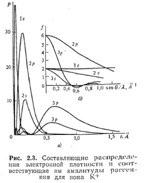 Найбільший внесок в когерентне розсіювання вносять внутрішні електрони атома. Зовнішні електрони атома обумовлюють інтенсивне когерентне розсіювання при малих кутах. Це виразно видно з мал. 2.3,а, на якому представлено радіальний розподіл електронної густини ls22s22p63s23p6 електронів іона К+. Там же показане (мал. 2.3,6) відповідне їм f-криві розсіювання. З малюнка видно, що чим далі від ядра знаходиться дана група електронів, тим швидше убуває відповідна їй f-функція з кутом розсіювання. Дійсно, порівнюючи f-криві для ls2-,2s2- і 3s2 электронов іона К+, бачимо, що значення f1s, обумовлене розсіюванням ls2-электронов (r1 = 0,03 Å), майже не змінюється з кутом розсіювання; f2s — крива, обумовлена розсіюванням 2s2-электронами (r2 = 0,18 Å), монотонно спадає, тоді як для f3s -кривої (r3= 0,6 Å) характерне швидке убування з переходом в область негативних значень з подальшою сильно затухаючою осциляцією біля осі абсцис. Амплітуда сумарного розсіювання іона К+