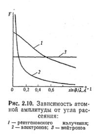 Якщо в розсіянні бере участь не одне ядро, а деякий колектив ядер, то розсіювання повільних нейтронів матиме когерентну і некогерентну складові. Когерентне розсіювання викликається впорядкованим розташуванням ядер. У некогерентному розсіянні ядра беруть участь неузгоджено, що говорить про безлад в розташуванні ядер. Наявність у нейтрона магнітного моменту приводить до магнітного розсіювання нейтронів речовиною. Якщо магнітні моменти атомів або іонів розсіювача орієнтовані хаотично (парамагнетіки), то магнітне розсіювання має дифузний характер. Якщо ж останні мають впорядковану орієнтацію (феромагнетики і антиферомагнетики), то магнітне розсіювання повільних нейтронів є когерентним і разом з ядерним когерентним розсіюванням вносить внесок в загальне розсіювання. Аналіз даних по розсіянню нейтронів дає пряму інформацію про розподіл і орієнтацію магнітних моментів атомів в досліджуваній речовині, що неможливо одержати інакше. На мал. 2.10 показані атомні амплітуди когерентного розсіювання рентгенівського випромінювання, електронів і нейтронів. Найсильніша залежність атомної амплітуди від кута розсіювання у електронів, менш сильна — у рентгенівського випромінювання і зовсім вона відсутня у повільних нейтронів. Це враховується при постановці і проведенні структурних досліджень.