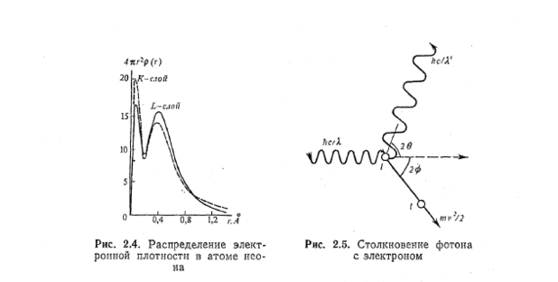 В розсіяному випромінюванні присутні хвилі із зміненою довжиною хвилі. Вони виникають в результаті ефекту Комптона, тобто зіткнень первинних фотонів рентгенівського випромінювання із зовнішніми слабкозв'язанними електронами атомів. Фотон при зіткненні з електроном віддає йому частину енергії і імпульсу, і передає кінетичну енергію mυ2/2 (мал. 2.5). Відхиляючий від первинного напряму, фотон має вже меншу енергію і менший імпульс і має велику довжину хвилі. Нехтуючи релятивістськими ефектами, запишемо: