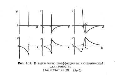 Допустимо, що досліджувана речовина складається з симетричних молекул діаметром а, між якими діють тільки сили відштовхування. Радіальна функція розподілу, і залежність енергії взаємодії молекул від відстані між ними виглядають так, як показано на мал. 2.12. З нього виходить, що